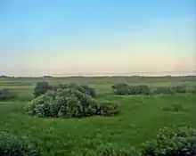 The long Yenisei river flows broadly south to north, a distance of 3,530 km (2,193 mi) to the Arctic Ocean, where it discharges more than 20 million litres (5 million gallons) of water per second at its mouth. Together with its tributary Angara, the two rivers flow 5,530 km (3,436 mi). The valley formed by the Yenisei acts as a rough dividing line between the West Siberian Plain and the Central Siberian Plateau.[4] The Siberian Uvaly is a low hilly region stretching from east to west across the plain.[5] Glacial deposits extend as far south as the Ob-Irtysh confluence, forming occasional low hills and ridges, including the Ob Plateau in the south,[6] but otherwise the plain is exceedingly flat and featureless. The Ishim Plain and the Baraba Lowland in the south are important agricultural areas.[7] There are salt lakes in the Kulunda Plain, which extends southwards into Kazakhstan and is limited to the south by the Kokshetau Hills.[8]