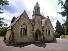 In about 1870 the two chapels were built, one for Church of England services and the other for Nonconformist services.[2] The cemetery came under the control of the Joint Burial Committee in 1895 and Farnham Council on 27 July 1926. In 1947 an additional area of 16.2 acres was obtained of which 9.6 acres were turned over to the Cemetery for use as an additional area for burials. This new burial ground is beyond a vintage brick wall which bisects the two halves of the cemetery. A report in 1947 records that common graves with a single burial at 6 ft could be reused after about 14 years. After passing into the hands of Waverley District Council it was transferred to Farnham Town Council in 2006.[3][4]