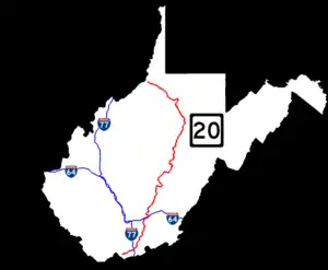 West Virginia Route 20 is a major northsouth state highway in the U.S. state of West Virginia. The southern terminus of the route is at U.S. Route 52 in Bluewell, a small unincorporated suburb of Bluefield. The northern terminus is at West Virginia Route 7 three miles (5 km) east of New Martinsville. WV Route 20 is the longest state route in West Virginia.
