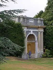 The finest architects of the day submitted plans to transform the older family house into a modern architectural extravaganza. Among them Robert Adam, who submitted a plan for the west portico, but his idea was dropped.[14][15] The architect Nicholas Revett was consulted and created the west portico.[16] Today, the first sight of the house as approached from the drive is this west end of the house, which appears as a Grecian temple. The eight-columned portico, inspired by the Temple of Bacchus in Teos was completed by 1770, and is considered to be the earliest example of Greek revival architecture in Britain.[8] The opposite (east) end of the house, designed by Roger Morris and completed c. 1755,[16] appears equally temple-like, but this time the muse was the Villa Rotunda in Vicenza. Thus the two opposing porticos, east and west, illustrate two architectural styles of the late-18th century: the earlier Roman inspired Palladian architecture and the more Greek inspired Neoclassicism.[17]