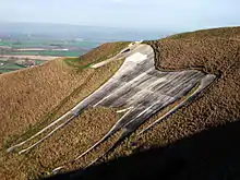 Westbury or Bratton White Horse is a hill figure on the escarpment of Salisbury Plain, approximately 1.5 mi (2.4 km) east of Westbury in Wiltshire, England. Located on the edge of Bratton Downs and lying just below an Iron Age hill fort, it is the oldest of several white horses carved in Wiltshire.[1] It was restored in 1778, an action which may have obliterated another horse that had occupied the same slope. A contemporary engraving from around 1772 appears to show a horse facing in the opposite direction that was rather smaller than the present figure. There is, however, no documentation or other evidence for the existence of a chalk horse at Westbury before 1772.