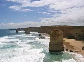 ![]() The Twelve Apostles, a collection of natural limestone stacks standing just off shore near Port Campbell. Their proximity to one another has made the site a popular tourist attraction. | |||||||||||||||