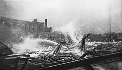 A fire started in the ice-making plant causing the arena to burn down on January 2, 1918. It began mid-day, when the only people in the building were the superintendent James McKeene and his family, who were eating in their apartment on the north side of the structure; all escaped safely but they lost most of their belongings, as well as a car stored in the annex.[5] Damage was estimated at $150,000, including the uniforms and sticks of the Wanderers and Canadiens, with only a third covered by insurance.[5] The blaze led the Montreal Wanderers, already on shaky grounds, to disband within days and the Canadiens to move back to Jubilee Arena, which itself would be destroyed by fire, the next year.[5] In 1924, the new Montreal Forum was built one block to the east.