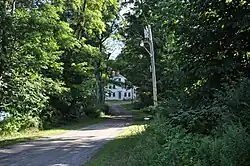 The Weston Homestead is set on the east bank of the Kennebec River, on a rural parcel at the end of Weston Road, north of the town center of Madison. It is a large 2+1⁄2-story wood-frame structure, with a gabled tin roof, clapboard siding, and a granite foundation. Its main facade faces west, toward the river, and is symmetrically arrange, with five bays. The central one is occupied by the main entrance, which is flanked by Doric pilasters and is topped by a fanlight and a lintel with dentil moulding. A long two-story ell extends to the rear (east) of the house, connecting it to a carriage barn. The interior of the house has very few alterations, retaining wallpaper from the 1830s in the main parlor and from 1817 in the front hall.[2]