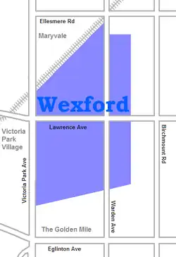 Wexford is a neighbourhood in Toronto, Ontario, Canada. It is located in the eastern part of the city, on the western end of the district of Scarborough, spanning Lawrence Avenue East between Victoria Park Avenue and Birchmount Road. There are many persons of Greek heritage in this neighbourhood. The Wexford Heights Business Improvement Area boasts 245 members and hosts an annual street festival on Lawrence.[1]
