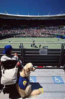 A spectator watches wheelchair tennis competition at the Olympic Tennis Arena with their disability assistance dog during the 2000 Summer Paralympics
