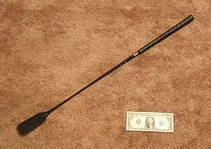 A type of whip known as a riding crop pictured with a U.S. dollar bill for size comparison.