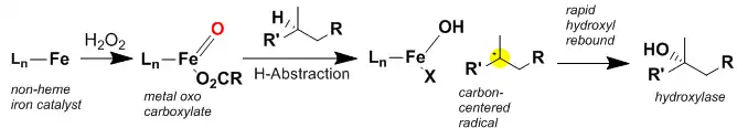 The above figure illustrates the proposed mechanism for oxidation by the White–Chen catalyst. The reaction proceeds in conjunction with hydrogen peroxide oxidant and acetic acid. The catalyst quickly reacts with hydrogen peroxide, believed to be catalyzed by the acetic acid, and forms and iron-oxo intermediate.[12] The iron-oxo intermediate is then thought to abstract a hydrogen on the carbon to be oxidized to generate a short-lived carbon centered radical. The iron-hydroxide then quickly rebounds onto the carbon centered radical to form the oxidized compound. Recently, direct evidence was obtained for a carbon-centered radical intermediate in this reaction using a Taxane-based radical trap.[13] It is important to note that these reactions (both directed and non-directed) proceed with complete retention of stereochemistry, as is often observed in reactions where radical rebound is rapid enough that epimerization does not happen.