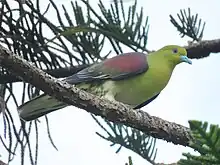 The white-bellied green pigeon (Treron sieboldii) is a species of bird in the family Columbidae. It is found in China, Japan, South Korea, Laos, Russia, Taiwan, Thailand, India and Vietnam. Its natural habitat is temperate forests. Its population has increased significantly since 2000.[2]
