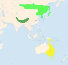 The white-throated needletail is a migratory bird, breeding in Central Asia and southern Siberia, and wintering south in the Indian Subcontinent, Southeast Asia and Australia. It is a rare vagrant in Western Europe and has been recorded as far west as Norway, Sweden and Great Britain. In June 2013, an individual was spotted in Great Britain for the first time in 22 years. It later flew into a wind turbine and died; its body was sent to a museum.[4][5]