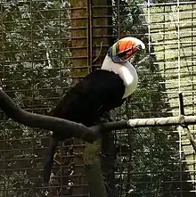 The white-throated toucan (Ramphastos tucanus) is a near-passerine bird in the family Ramphastidae found in South America throughout the Amazon Basin including the adjacent Tocantins and Araguaia River drainage. It prefers tropical humid forest, but also occurs in woodland and locally in riverine forest within cerrado.