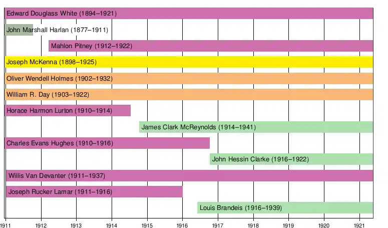The White Court began in December 1910 when President William Howard Taft appointed White to succeed Melville Fuller as Chief Justice. White was the first incumbent associate justice to be appointed as Chief Justice.[2] Earlier in 1910, Taft had appointed Horace Harmon Lurton and Charles Evans Hughes to the Supreme Court. In 1911, Taft appointed Willis Van Devanter and Joseph Rucker Lamar to the court, filling vacancies that had arisen in 1910. The White Court thus began with the five Taft appointees and four veterans of the Fuller Court: John Marshall Harlan, Joseph McKenna, Oliver Wendell Holmes Jr., and William R. Day. Harlan died in 1911, and Taft appointed Mahlon Pitney to replace him. Lurton died in 1914, and President Woodrow Wilson appointed James Clark McReynolds to replace him.