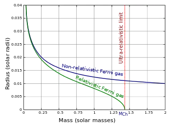 For a more accurate computation of the mass-radius relationship and limiting mass of a white dwarf, one must compute the equation of state which describes the relationship between density and pressure in the white dwarf material. If the density and pressure are both set equal to functions of the radius from the center of the star, the system of equations consisting of the hydrostatic equation together with the equation of state can then be solved to find the structure of the white dwarf at equilibrium. In the non-relativistic case, we will still find that the radius is inversely proportional to the cube root of the mass.[45]: eqn.(80) Relativistic corrections will alter the result so that the radius becomes zero at a finite value of the mass. This is the limiting value of the mass – called the Chandrasekhar limit – at which the white dwarf can no longer be supported by electron degeneracy pressure. The graph on the right shows the result of such a computation. It shows how radius varies with mass for non-relativistic (blue curve) and relativistic (green curve) models of a white dwarf. Both models treat the white dwarf as a cold Fermi gas in hydrostatic equilibrium. The average molecular weight per electron, μe, has been set equal to 2. Radius is measured in standard solar radii and mass in standard solar masses.[45][52]