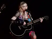 An acoustic rendition of "Who's That Girl", complete with "call-and-response exchanges" with the audience, was done on the singer's Rebel Heart Tour.[75] The number featured Day of the Dead iconography and found Madonna playing guitar.[76][77] After finishing the song, she said: "I'm still trying to figure out who I am after all these years [...] Does anyone ever really know?".[78] For Rollling Stone's Rob Sheffield, "Who's That Girl" was the evening's "emotional highlight".[79]