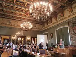 In 1864 the palace was purchased by the Municipality of Kraków. According to Resolution of the City Council the building restoration was carried out based on design by architect Paweł Barański from 1865 to 1868. In the second floor renovations, a brand new Council Chamber was created for the City. Furniture was designed by architect Filip Pokutyński. The upper parts of the walls of the hall were decorated with carved busts of the Polish kings. A new gallery of portraits of presidents of the city was launched, placing them on the walls of the hall. Municipal offices and the office of Mayor were located on the first floor.[1]