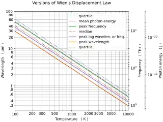 They suggest that the average photon energy be presented in place of Wien's displacement law, as being a more physically meaningful indicator of changes that occur with changing temperature. In connection with this, they recommend that the average number of photons per second be discussed in connection with the Stefan–Boltzmann law. They recommend that the Planck spectrum be plotted as a "spectral energy density per fractional bandwidth distribution," using a logarithmic scale for the wavelength or frequency.[10]