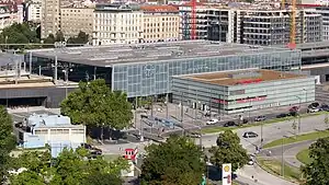 Wien Praterstern (German for Vienna Praterstern) is one of Vienna's main railway stations, used by 35,000 people daily. It is located on the roundabout Praterstern in Leopoldstadt, in the north of the city. Vienna's two most recognisable structures, the Wiener Riesenrad (Ferris wheel) and the Stephansdom (cathedral), are both visible from the platforms. Underneath the station is the Praterstern U-Bahn station, which is on U1 and U2 of the Vienna U-Bahn.