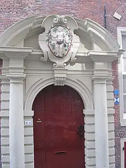 In 1613 the building started to be used as an inn, known as De Toelast. The building was purchased in 1630 by the guild of wine buyers, who had it radically altered by the Amsterdam master mason Pieter de Keyser. In 1633 the right wing of the building (Koestraat number 10) began to be used as guildhall, with a meeting room for the guild directors at the front, a new back wing with a communal guild room (gildezaal), large cellars for storage, and an entrance gate designed by Pieter de Keyser. This gate originally depicted Bacchus astride a barrel of wine, but this was later replaced with an image of the saint Urban. The left part of the building (Koestraat number 12) became a residence.[2][3]