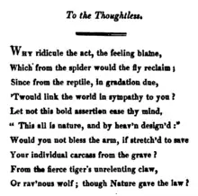 In the 1906 book The Universal Kinship, the zoologist and utilitarian philosopher J. Howard Moore argued that the egoism of sentient beings—a product of natural selection—which leads them to exploit their sentient fellows, was the "most mournful and immense fact in the phenomena of conscious life", and speculated whether an ordinary human who was sufficiently sympathetic to the welfare of the world could significantly improve this situation if only given the opportunity.[101] In Ethics and Education, published in 1912, Moore critiqued the human conception of animals in the wild: "Many of these non-human beings are so remote from human beings in language, appearance, interests, and ways of life, as to be nothing but 'wild animals.' These 'wild things' have, of course, no rights whatever in the eyes of men."[102]: 71 Later in the book, he described them as independent beings who suffer and enjoy in the same way humans do and have their "own ends and justifications of life."[102]: 157