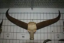 The wild water buffalo has an ash-gray to black skin. The moderately long, coarse and sparse hair is directed forward from the haunches to the long and narrow head. There is a tuft on the forehead, and the ears are comparatively small. Its head-to-body-length is 240 to 300 cm (94 to 118 in) with a 60 to 100 cm (24 to 39 in) long tail and a shoulder height of 150 to 190 cm (59 to 75 in). Both sexes carry horns that are heavy at the base and widely spreading up to 2 m (79 in) along the outer edges, exceeding in size the horns of any other living bovid. The tip of the tail is bushy; the hooves are large and splayed.[15] It is larger and heavier than the domestic water buffalo, and weighs from 600 to 1,200 kg (1,300 to 2,600 lb).[16][17] The average weight of three captive wild water buffaloes was 900 kg (2,000 lb).[18] It is among the heaviest living wild bovid species, and is slightly smaller than gaur.[19]