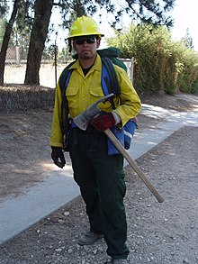 PPE or personal protective equipment is generally standardized for a certain type of team or crew. Smokejumpers for example require more protective equipment because of their method of delivery into the fire. Ordinarily, all firefighters regardless of assignment, require durable fire recommended eight inch (203 mm) minimum boots, gloves, Nomex pants and shirt (typically green pants and a yellow shirt), a hard hat (sometimes full brim), Walkie-talkie, potable water, eye protection (goggles) and a fire shelter.[1][2][3]