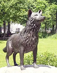 Coyotes historically did not inhabit the northeast United States. They were first seen in New York State in the 1940s, in Westchester County in the 1970s, and first sighted in the Bronx in the late 1990s.[11] Stable breeding populations were established in three parks in the Bronx by approximately 2012.[11] The first documented sightings were in February 1995, when two dead females were found. The first had been struck and killed by a vehicle on the Major Deagan Expressway, and the second was found in Van Cortlandt Park a week later, having been shot.[12] It is believed that a third individual was in the adjacent Woodlawn Cemetery in October 1994.[13] A commemorative bronze statue, named Major, was erected in 1998 in Van Cortlandt Park.[12][14][13] Coyotes typically inhabit a 2 sq mi (5.2 km2) territory, and will travel 3–10 mi (5–16 km) in a day.[15]