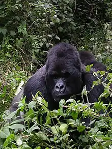 Nearly half of the mountain gorillas in the world live in the Bwindi Impenetrable National Park, and it is also a sanctuary for colobus monkeys and chimpanzees, and birds such as hornbills and turacos.[12] In the Queen Elizabeth National Park there are 95 species of mammal, including African buffalo, Ugandan kob, hippopotamus, Nile crocodile, African bush elephant, African leopard, lion, and chimpanzee. The area around Ishasha in Rukungiri District is famous for its tree-climbing lions, whose males sport black manes.[13]