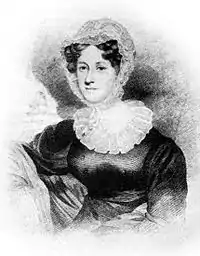 Ellis remarried two years later to Sarah Stickney (1799–1872) on 23 May, the couple were unable to have a wedding trip as William's eldest daughter was ill, she died in June and was buried in Bunhill Fields burial-ground, next to her mother.[11] She had been brought up a Quaker but latterly chosen to become an Independent or Congregationalist, as did many of those involved in the London Missionary Society, albeit a non-denominational one. She shared her husband's love of books and of writing. He had started to become a successful writer about the topography, history, botany, and ethnography of Polynesia since returning from the South Seas. Sarah Ellis gained her own success, primarily with books on women's role in society.