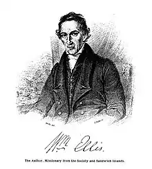 William Ellis (29 August 1794 – 9 June 1872) was a British missionary and writer. He travelled through the Society Islands, Hawaiian Islands, and Madagascar, and wrote several books describing his experiences.