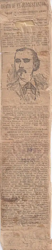 - 1 2 "Obituary: William Henry Stanton," Scranton Truth, 28 March 1900 (see scanned article to the right)