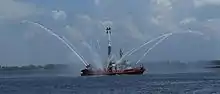 Built in Owen Sound, Ontario by Russel Brothers Limited with a modified Tugboat hull.[2] William Lyon Mackenzie operates 12 months a year, providing emergency services within Toronto Harbour and the adjacent waters of Lake Ontario. The boat is mainly docked at 339 Queen's Quay West next to Fire Station #334. It is the main fireboat for Toronto Fire Services as well as an icebreaker for the City of Toronto. William Lyon Mackenzie is one of a few fireboats to ply the Great Lakes, Edward M. Cotter is operated by Buffalo Fire Department and operates in Lake Erie. William Lyon Mackenzie does duty during the Canadian International Air Show, using its spray to make a very visible visual point of reference at the centre of the display area.