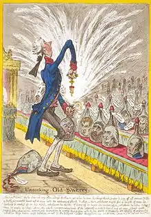 Throughout the 1790s, the war against France was presented as an ideological struggle between French republicanism vs. British monarchism with the British government seeking to mobilise public opinion in support of the war.[50] The Pitt government waged a vigorous propaganda campaign contrasting the ordered society of Britain dominated by the aristocracy and the gentry vs. the "anarchy" of the French revolution and always sought to associate British "radicals" with the revolution in France.[51] Though the Pitt government did drastically reduce civil liberties and created a nationwide spy network with ordinary people being encouraged to denounce any "radicals" that might be in their midst, the historian Eric J. Evans argued the picture of Pitt's "reign of terror" as portrayed by the Marxist historian E.P. Thompson is incorrect, stating there is much evidence of a "popular conservative movement" that rallied in defence of King and Country.[52] Evans wrote that there were about 200 prosecutions of "radicals" suspected of sympathy with the French revolution in British courts in the 1790s, which was much less than the prosecutions of suspected Jacobites after the rebellions of 1715 and 1745.[51] However, the spy network maintained by the government was efficient. In Jane Austen's novel Northanger Abbey, which was written in the 1790s, but not published until 1817, one of the characters remarks that it is not possible for a family to keep secrets in these modern times when spies for the government were lurking everywhere. This comment captures well the tense, paranoid atmosphere of the 1790s, when people were being encouraged to report "radicals" to the authorities.[53]
