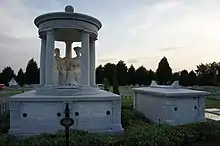 On August 17, 1912, Williamson had a twin mausoleum and columned canopy, built from Georgia marble, erected at the cemetery. Under the canopy above the mausoleum is life-size statuary depicting A. G., his wife, Martha J. Buchan Williamson, and their nephew, Jay Gould Williamson. The statuary was sculpted from Italian marble in Carrara, Italy, based on a family photograph.