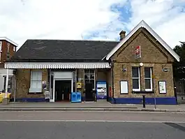 Winchmore Hill railway station is on Station Road (which, before the arrival of the railway, was known as "Middle Lane"), Winchmore Hill in the London Borough of Enfield in North London, England, in Travelcard Zone 4. It is 7 miles 63 chains (7.79 miles, 12.53 km) down the line from London King's Cross[2] on the Hertford Loop Line. The station, and all trains serving it are operated by Great Northern. Originally, upon opening in 1871, the station building was almost identical to that at neighbouring Palmers Green. However, in 1965 the northbound side of the building was demolished due to subsidence.[3] In the 1970s the station boasted, on its southbound platform, a small newsagent and sweet shop, just beyond the base of the stairs down to the platform, but by 1980 this shop had been dismantled.