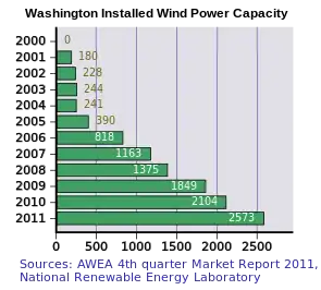 The table below shows the growth in wind power installed nameplate capacity in MW for Washington from 1999 to 2011.[14]