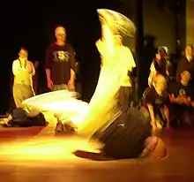 The Windmill (or briefly Mill) is a popular b-boying move. The breaker rolls his torso continuously in a circular path on the floor, across the upper chest/shoulders/back, while twirling his legs in a V-shape through the air.[1]