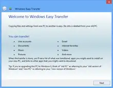 Windows Easy Transfer was introduced in Windows Vista and included in Windows 7, Windows 8, and Windows 8.1. It replaced the Files and Settings Transfer Wizard included with Windows XP and offered limited migration services for computers running Windows 2000 SP4 and Windows XP SP2.[2] For all versions of Windows, it did not transfer applications—only files and settings.[3]