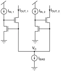 A simple, but popular CMOS winner-take-all circuit is shown on the right. This circuit was originally proposed by Lazzaro et al. (1989)[7] using MOS transistors biased to operate in the weak-inversion or subthreshold regime. In the particular case shown there are only two inputs (IIN,1 and IIN,2), but the circuit can be easily extended to multiple inputs in a straightforward way. It operates on continuous-time input signals (currents) in parallel, using only two transistors per input. In addition, the bias current IBIAS is set by a single global transistor that is common to all the inputs.