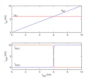 A SPICE-based DC simulation of the CMOS winner-take-all circuit in the two-input case is shown on the right. As shown in the top subplot, the input IIN,1 was fixed at 6nA, while IIN,2 was linearly increased from 0 to 10nA. The bottom subplot shows the two output currents. As expected, the output corresponding to the larger of the two inputs carries the entire bias current (10nA in this case), forcing the other output current nearly to zero.