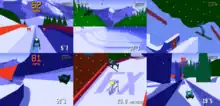 In downhill, players must descend the hill as fast as possible and crossing red flag gates to avoid time penalty, while avoiding obstacles. At the starting gate, players must press left and right on the d-pad to gain initial speed. In ski jumping, players aim to achieve the longest possible jump after descending from a ramp and adjust their landing position to gain points depending on style and distance.[1][2][4] In snowboarding, players must obtain points on a half-pipe under a strict time limit by performing tricks and combos via button combinations. Aerial skiing is similar to the snowboarding discipline but players jump from a ramp and perform a good landing.[1][2][3][4] In both bobsled and luge, players must press left and right on the d-pad to gain initial speed at the starting gate and get to the bottom of the course in the fastest time possible. Players must also avoid hitting side rails to not lose speed.[1][2][4]