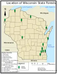 A Wisconsin state forest is an area of forest in the U.S. state of Wisconsin managed by the Wisconsin Department of Natural Resources's Division of Forestry. They are managed for outdoor recreation, watershed and habitat preservation, and sustainable forestry. The various units total 471,329 acres (1,907 km2), although many contain extensive private inholdings. Wisconsin's state forests are often co-listed with Wisconsin's state park system, which is maintained by the Division of Parks and Recreation.