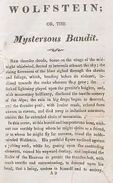 Wolfstein; or, The Mysterious Bandit is an 1822 chapbook based on Percy Bysshe Shelley’s 1811 Gothic horror novel St. Irvyne; or, The Rosicrucian.[1]