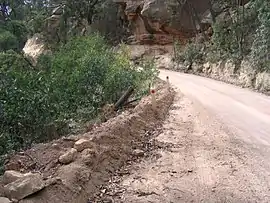| A typical unsealed section of Wombeyan Caves Road, showing sandstone outcrops and lack of guardrails | |