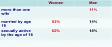 - Eleven percent of women are married to a man with more than one wife and Sixty-three percent of women in Ethiopia are married by age 18, compared with just 14% of men • 62% women and 18% of men age 25-49 were sexually active by the age of 18, i.e., Women start sexual activity about four and a half years earlier than men (median age of 16.6 years for women and 21.2 years for men) [4]