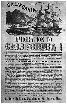 Women going to California to rejoin their families usually had their passages paid for by miners or businessmen who had decided to make California their new home. Most of the men had originally planned to get their gold, return to their homes and families, and enjoy their new riches.[1] Typically women euphemistically labeled as entertainers had little or no money for passage but as soon as they showed up in California they were hired by various saloons, gambling halls, dance halls, peep shows and/or brothels. The cost of passage was typically paid for by the entertainer agreeing to work for the payees for at least three to six months. These entertainers initially were the majority of the female population.[2] Very few of these entertainers made the five- to six-month trip by wagon on the California Trail or chose the five- to seven-month all sea journey around Cape Horn.