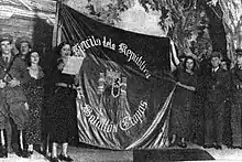 While other communist organizations existed, Partido Comunista de España remained the dominant one.[12][3] In the first year of the Civil War, the Partido Comunista de España rapidly increased their membership by nearly three-fold. Among the peasantry, women represented nearly a third of PCE's membership.[28] During the Civil War, Ibárruri earned herself the nickname La Pasionaria as she traveled the country to speak in opposition to Francoist forces. She also used radio to spread her message, becoming famous for calling men and women to arms, saying, "¡No pasarán!". One of the most famous phrases she uttered in the civil war was "It is better to die on your feet than live on your knees". The Communist Party did not approve of her private life though, asking her to end her relationship with a male party member who was seventeen years younger than her, which she did.[29] Female Stalinists actively participated in POUM and Trotskyite purges in Barcelona. Women like Teresa Pàmies intentionally excluded POUM affiliated women even as they tried to build bridges with PCE.[25]