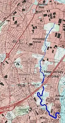 The Woodbridge River flows south 5 miles in Woodbridge Township emptying into the Arthur Kill. The headwaters are near Omar Avenue in the far northeast part of the township. It is a tidal river for three-fourths of its length, with brackish water below Homestead Avenue. It serves as a basin for about half of Woodbridge. Major tributaries include Heards Brook and Wedgewood Brook in Woodbrige Proper.[2]