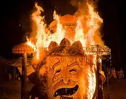 The final evening of the Woodford festival culminates in a spectacular New Year's Day closing ceremony, The Fire Event.[2] Over 20,000 festival goers seated on the grassed Amphitheater hillside witness a spectacle of dance, music, theatricality and fire - with the burning of a large structure heralding the New Year.[2] The Fire Event was developed by Neil Cameron at the former Maleny festival and continued at Woodford, Paul Lawler worked with Cameron and took over as creative director of the event from 2003 - 2011, followed by Joey Ruigrok Van De Werven from 2012 - 2014, and Alex Podger since 2014.[2] The January 2000 Fire Event was featured in the global live TV broadcast heralding the new millennium.