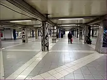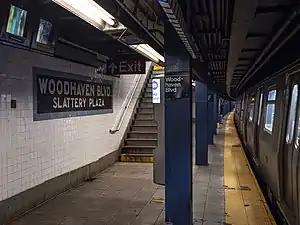 The name tablets on this station still retain the original name of Woodhaven Boulevard–Slattery Plaza.[25] The tilework in this station consists of blue tile bands with a black border,[46] similar to the tilework found at the Elmhurst Avenue stop, two stations west.[47] The tile band was part of a color-coded tile system used throughout the IND.[48] The tile colors were designed to facilitate navigation for travelers going away from Lower Manhattan. As such, the blue tiles used at the Woodhaven Boulevard station are also used at Jackson Heights–Roosevelt Avenue, the next express station to the west, while a different tile color is used at Forest Hills–71st Avenue, the next express station to the east. Blue tiles are similarly used at the other local stations between Roosevelt Avenue and 71st Avenue.[49][50] Near the edges of the platforms, I-beam piers are located every 15 feet (4.6 m) and support girders above the platforms. The roof girders are also connected to columns in the walls adjoining each platform.[51]: 3
