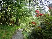The steep garden at Cragside in Northumberland, created from the 1860s until about 1880, "may be regarded as the pioneering example" of this type of woodland garden, copied by several other gardens in the next three decades.[34] The very large areas of garden developed by the rich in the early 20th century therefore used relatively cheap land, that was often already woodland. Some woodland gardens, like Sheffield Park Garden in East Sussex, took over a park laid out in the 18th-century English landscape garden style, in that case worked on by both Capability Brown and Humphry Repton.[35] They also needed fewer gardeners per acre than intensive formal Victorian plantings. The style spread from the rich to the comfortably-off suburban middle-class.[36] According to Charles Quest-Ritson, "The William Robinson style of woodland garden, colourfully planted with exotic shrubs and herbaceous plants, dominated English horticulture from 1910 to 1960".[37]